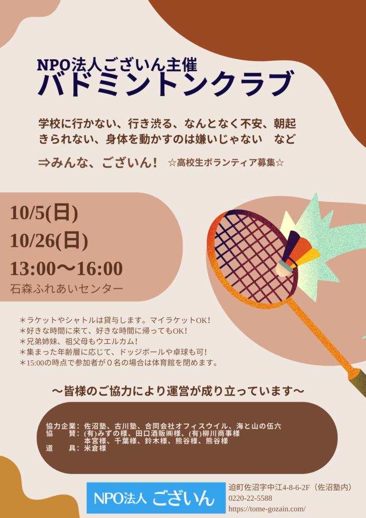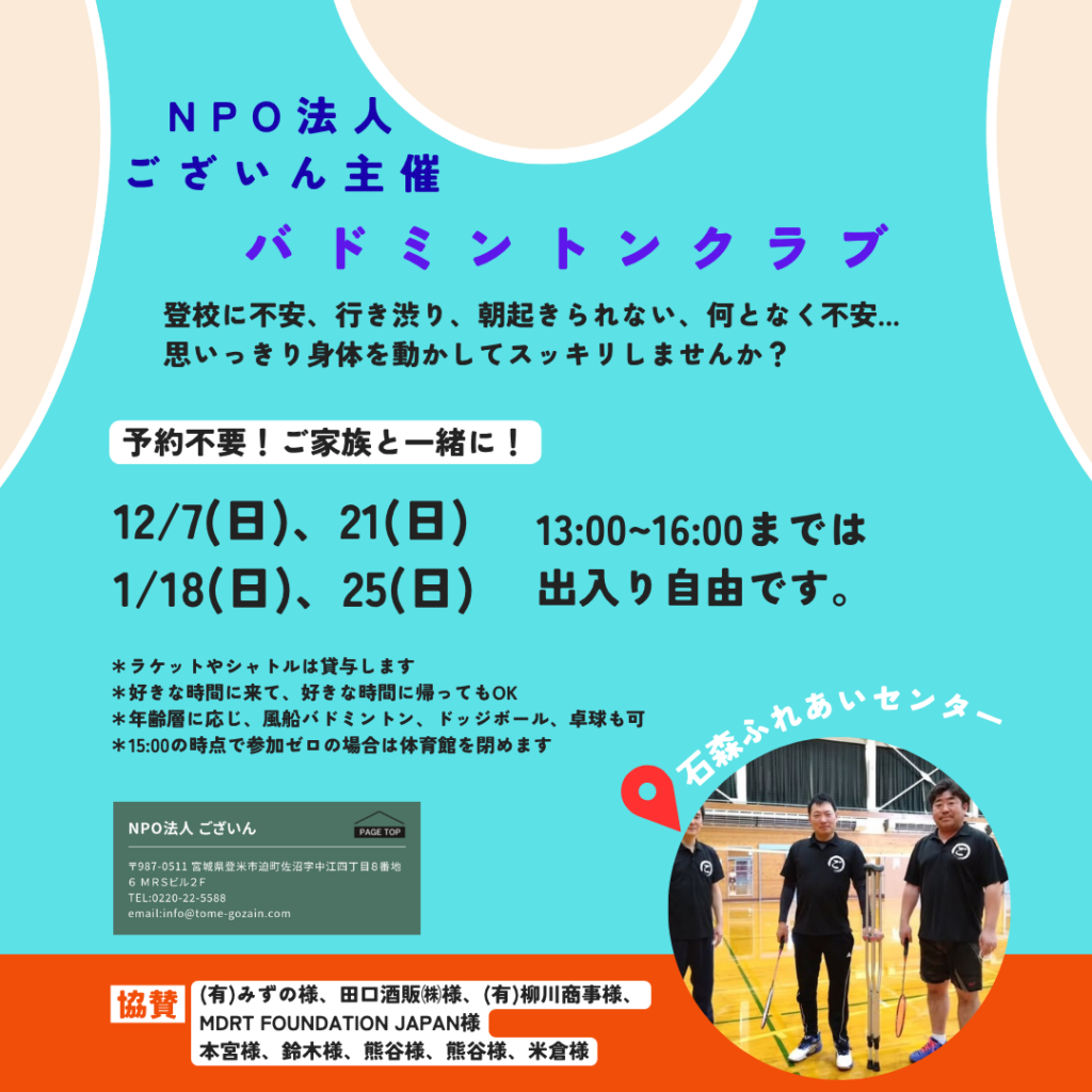 NPO法人ございんでは、不登校生とその家族を対象としたバドミントンクラブを開催しています。