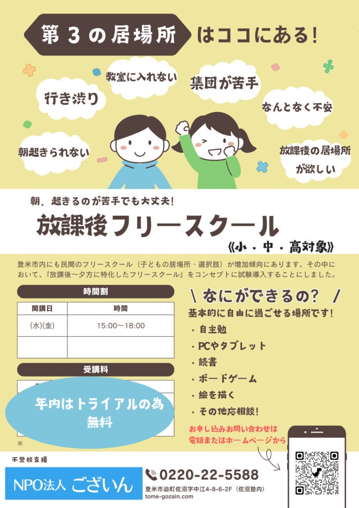 「朝起きられない」「不登校気味」「勉強に不安がある」「放課後の居場所が欲しい」などの不安を感じている児童生徒さんを対象に、放課後フリースクールをトライアルとして導入します。