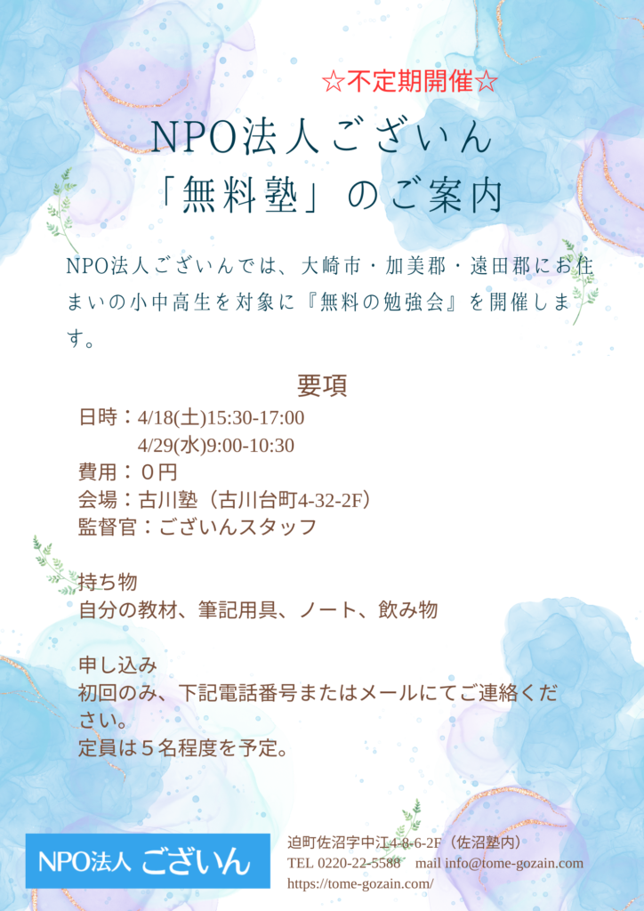 「不登校生学習サポート」は、学校に通えない子どもを対象に学習サポートを行っており、佐沼塾さまから学習スペースを無償提供していただいています。